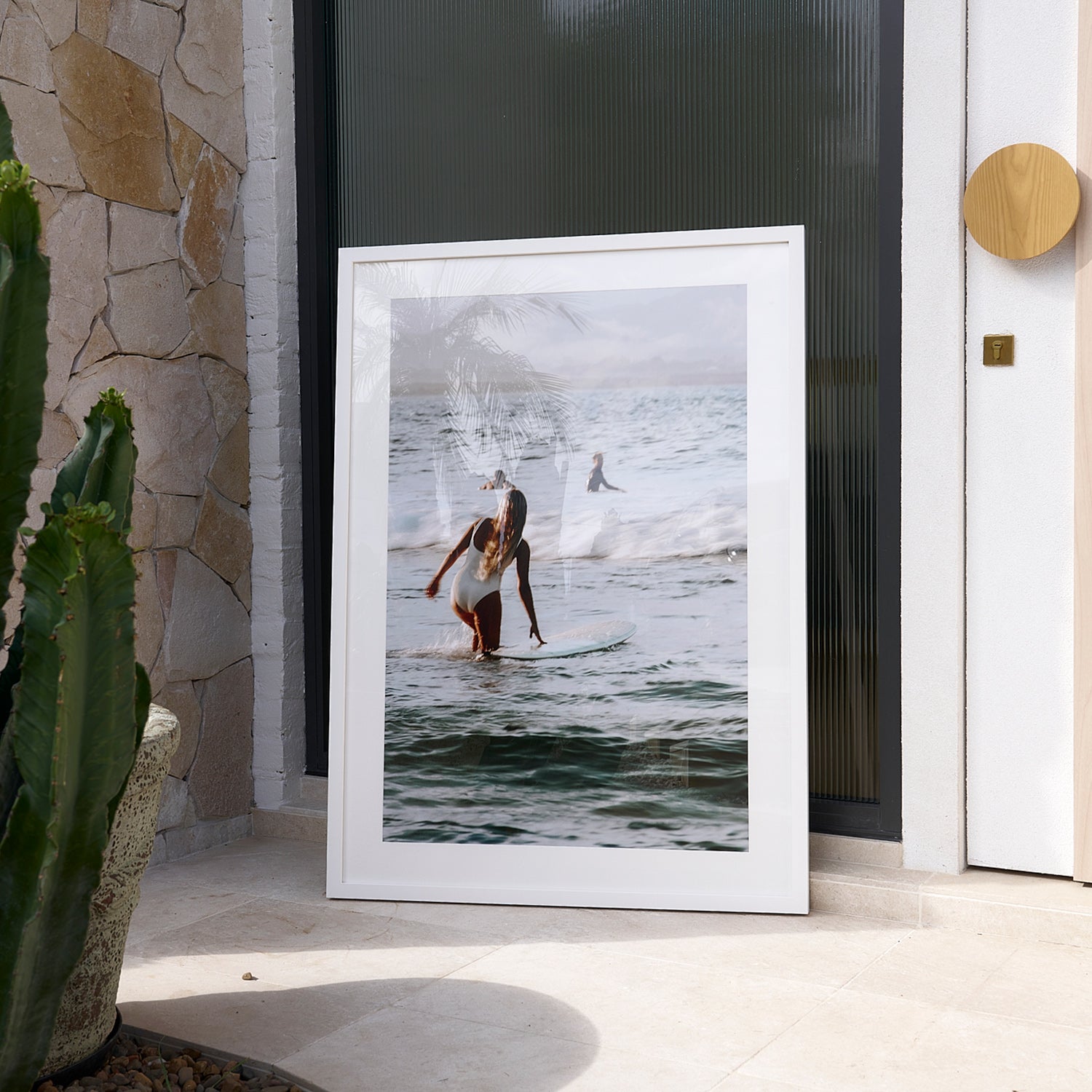 ‘Blondie’ is a vibrant fine art photography print captured in the heart of Byron Bay, Australia, a coastal paradise known for its stunning beaches and world-class surfing. This image features a beautiful blonde surfer walking into the ocean, her hand gently resting on her surfboard as it floats beside her in the shimmering blue-green water. A gentle wave rolls in, adding movement and life to the scene, while in the background, a couple of surfers wait patiently for the perfect wave. Inspired by Australian pro surfer Sally Fitzgibbons, this print embodies the free spirit and energy of summer adventures. With its soft ocean hues and serene coastal landscape, ‘Blondie’ brings the laid-back charm of Byron Bay into your home, making it the perfect addition for any surf or beach lover.