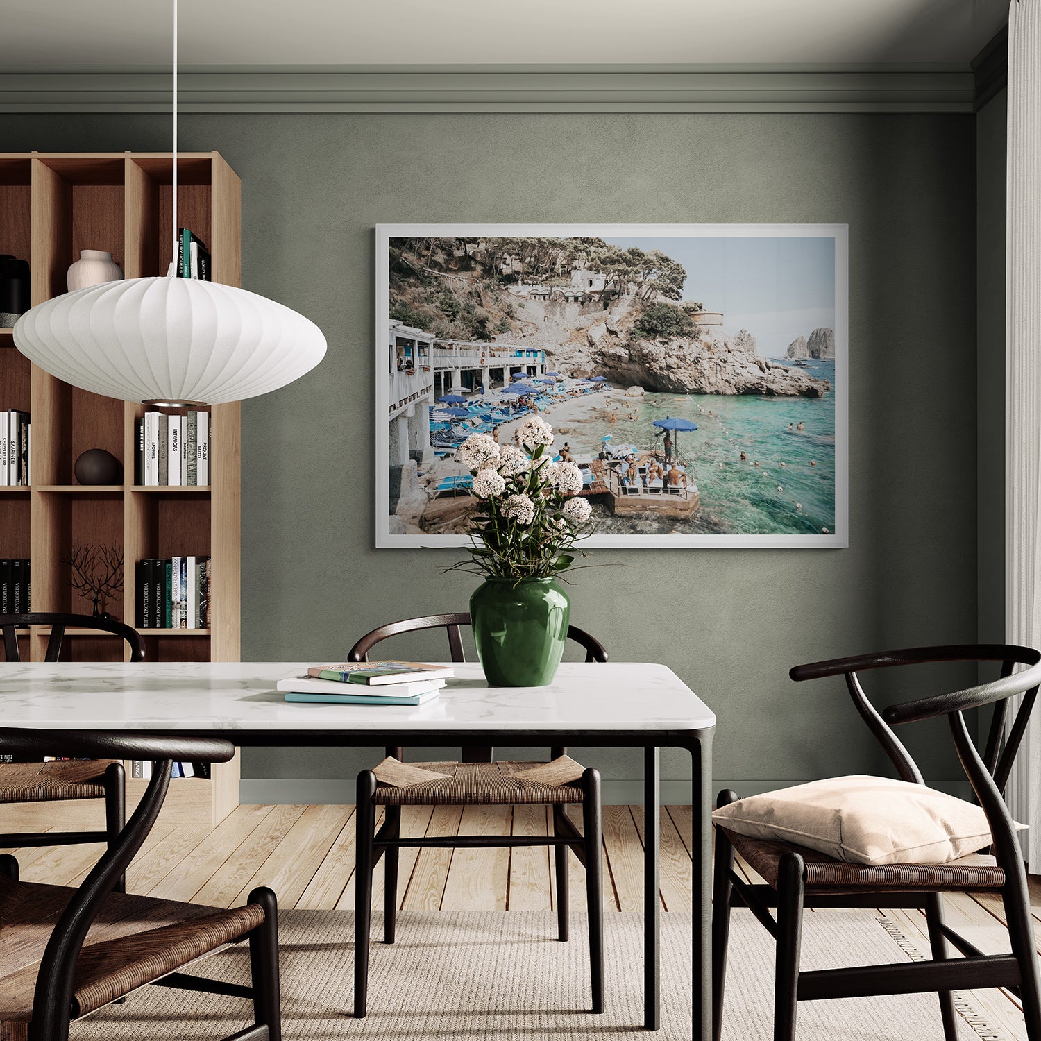 'Vita Bella', a fine art photography print, captures the tranquil beauty of Torre Saracena Beach Club in Capri, Italy. The scene is a breathtaking composition of deep blue ocean hues, blue-and-white striped umbrellas, and sun loungers bathed in golden sunlight. Perched above the beach, the white balcony of the restaurant overlooks the idyllic scene, while the lush greenery of the towering cliffs creates a dramatic backdrop. Known for its intimate, rock-hemmed shores, Capri offers only a handful of these secluded beaches, and Torre Saracena is a hidden gem within the bay of Marina Piccola. With white pebbles along the shoreline and a pontoon extending over the shimmering sea, it’s the perfect refuge for those seeking both sun and shade. The combination of pebbled shores, historic staircases carved into the rocks, and the turquoise sea - exclusive to Capri—makes this print a timeless invitation to experience the ultimate summer on the island. Let 'Vita Bella' transport you to a place where serenity and luxury coexist, adding the charm of Capri’s coast to your home.