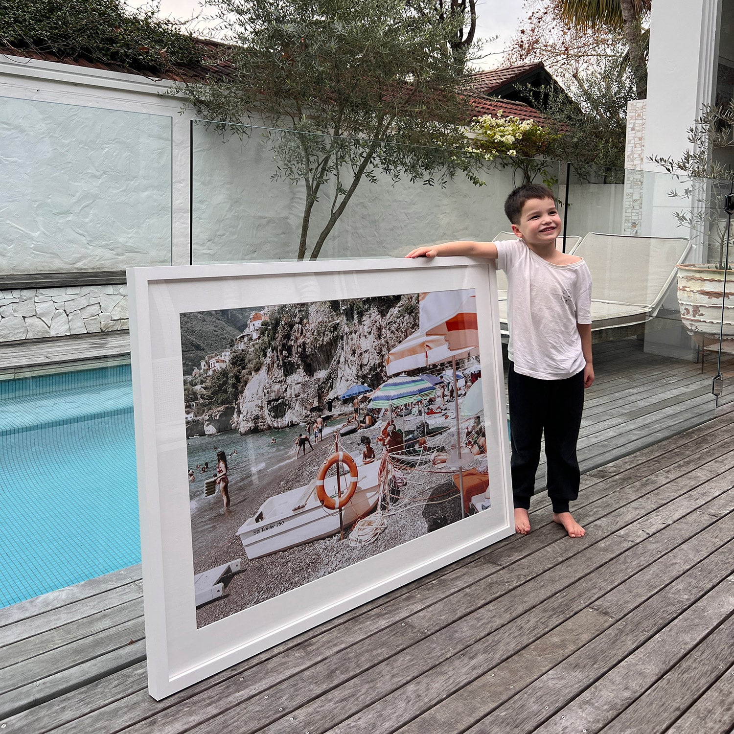 ‘Bellezza By The Bay’, a captivating fine art photography print, effortlessly captures the essence of pure bliss along the shores of Positano. This scene invites you into a world where joy fills every corner of the summer day, with the sound of children's laughter echoing across the pebbled beach and families revelling in the warmth of the Mediterranean sun. Amidst a sea of vibrant beach umbrellas in orange, green, and blue, playful swimmers dive into the shimmering azure waters while the sandy shore hosts timeless memories of sandcastles and sunbathing. The towering cliffs adorned with lush greenery provide a breathtaking backdrop, framing the beauty of this coastal haven. At the heart of this picturesque moment stands a cherubic boy, his eyes gleaming with the sheer delight of summer, embodying the magic of the season. With ‘Bellezza By The Bay’ gracing your walls, you can bring the joy, warmth, and charm of Positano into your space, a daily reminder of life's simple pleasures by the seaside.