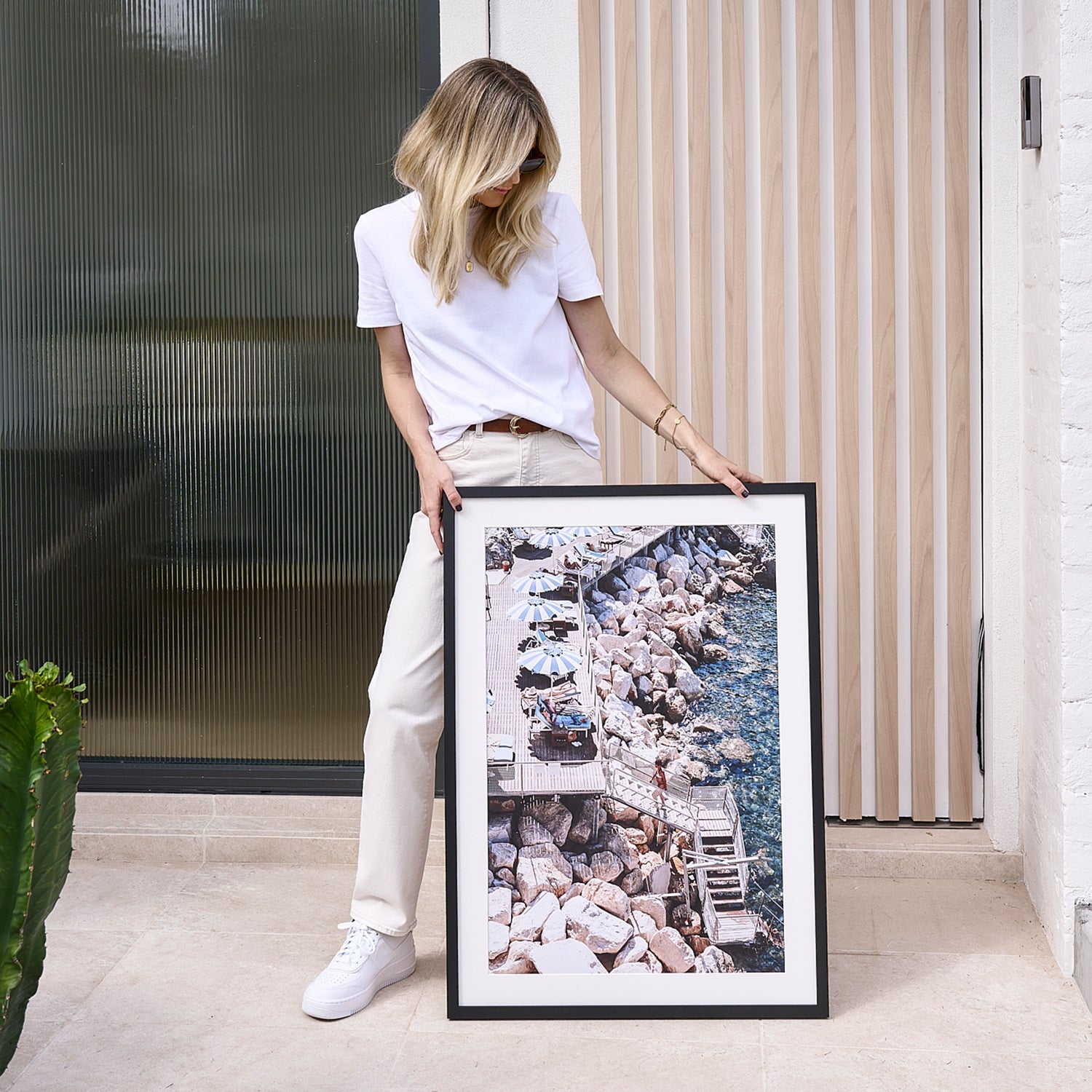 ‘Life On The Shore’ fine art photography print captures the magical allure of the Mezzatorre Hotel & Thermal Spa on the breathtaking shores of Ischia, Italy. Set within a rocky cove, the tranquil blue waters sparkle in the sunlight, inviting you to step into a world of serene beauty. Descending a set of steps, a woman emerges from the sea, her elegance blending seamlessly with the idyllic scene. White and blue lounge chairs line the deck, shaded by matching striped umbrellas, offering a luxurious space to soak in the surrounding splendour. The rocky edge and the inviting deck frame this picturesque moment, where nature’s beauty and human grace come together in perfect harmony. ‘Life On The Shore’ brings the essence of Mediterranean leisure to life, making it the perfect addition to any space that longs for a touch of elegance and tranquility. Immerse yourself in the calm and allure of Ischia with this stunning print, where every glance transports you to an enchanting coastal escape.