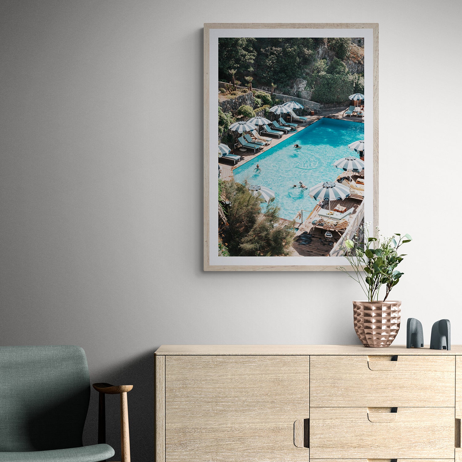 ‘Poolside Paradise’ is a captivating fine art photography print that transports you to the serene shores of Ischia, Italy, at the luxurious Mezzatorre Hotel & Thermal Spa. The scene beautifully captures a mother and her child floating peacefully in the sun-dappled waters of the hotel’s pristine pool. Two other swimmers glide through the calm blue water, adding to the harmonious, tranquil ambiance. Surrounded by vibrant blue umbrellas and inviting lounge chairs, this moment of quiet leisure is an ode to relaxation, where the world seems to pause, letting you bask in the simplicity of the moment. The azure tones of the pool blend seamlessly with the sky, evoking the essence of a perfect summer day. ‘Poolside Paradise’ brings the timeless beauty of Ischia to your home, offering a window to the Mediterranean's calming embrace that will transform any space into a retreat of tranquility and bliss.