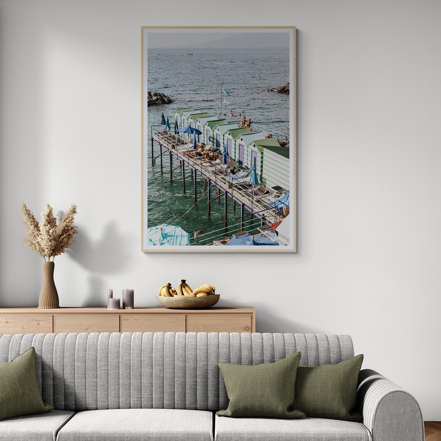 ‘Cabine da Spiaggia’ invites you to experience the serene beauty of Sorrento’s iconic coastline. This fine art photography print captures a tranquil moment on a sun-kissed deck, where colourful blue and green beach huts stand proudly against the backdrop of the glistening Mediterranean Sea. Beneath the warm Italian sun, people recline on lounge chairs, soaking up the peaceful atmosphere while boats float gently in the distance. The vibrant hues of the huts harmonise perfectly with the calming tones of the ocean, creating a picturesque scene that embodies the joy and relaxation of a perfect summer day in Sorrento. Add ‘Cabine da Spiaggia’ to your space to bring the timeless charm of Italy’s coast into your home, infusing it with the essence of Mediterranean bliss.