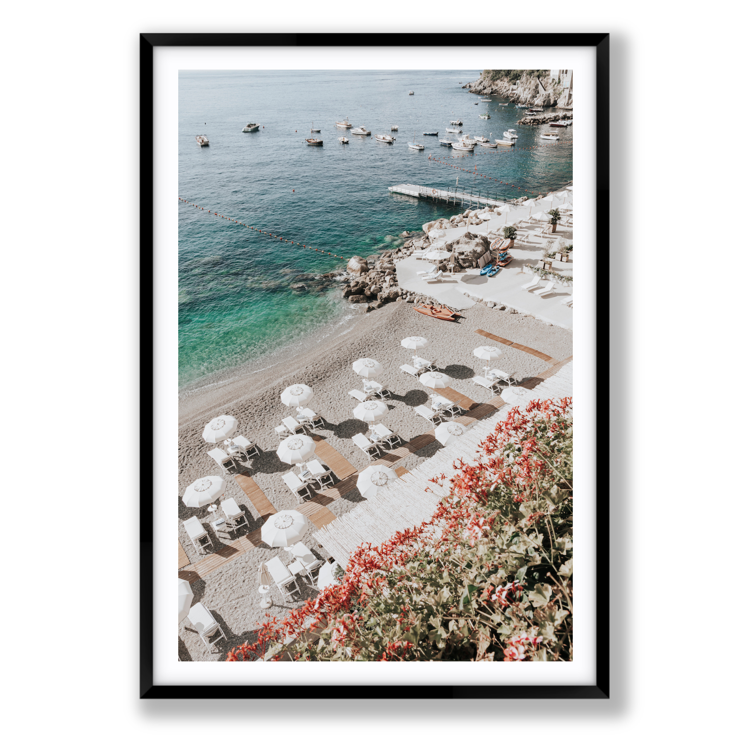 'Tranquil Oasis' fine art photography print transports you to the serene beaches of Amalfi, Italy. This stunning aerial view reveals a picturesque scene, where vibrant red flowers gracefully frame the bottom of the composition, adding a delightful contrast to the blue hues of the ocean. Below, white lounge chairs and umbrellas are perfectly arranged, inviting you to imagine yourself basking in the summer sun. The endless expanse of the Mediterranean stretches out, its mesmerizing blue tones reflecting the sky above. Boats gently float in the calm waters, and a majestic jetty juts into the sea, sparking thoughts of endless adventures. 'Tranquil Oasis' is the epitome of relaxation, a reminder of those cherished moments by the sea, making it a must-have for any coastal-inspired fine art collection. Let this captivating print bring the essence of Amalfi’s coastal beauty and peace into your home.