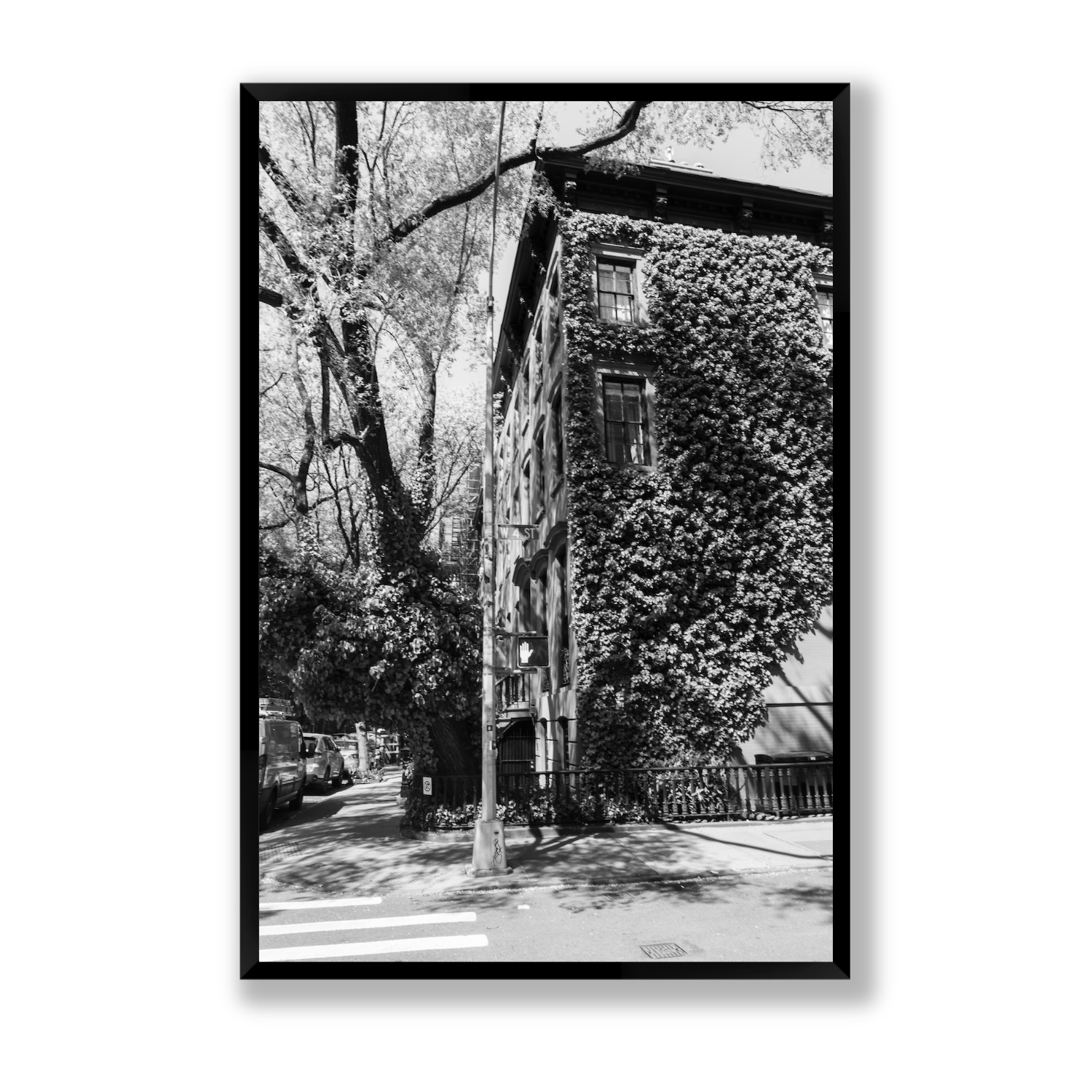 ‘Vertical Garden’ captures the natural beauty entwined with urban life in New York City’s West Village. This black-and-white fine art photography print features the iconic W 4 St street sign in front of a building completely draped in leaves and vines, creating a striking contrast between the architecture and the greenery. The lush tree beside the building adds to the sense of nature reclaiming its place in the city, blending urban design with the organic beauty of the neighbourhood. The scene exudes a calm yet vibrant energy, as the greenery softens the classic brick and stone structures of the West Village, turning the street corner into a serene urban oasis. This fine art print beautifully captures the harmonious blend of greenery and architecture, offering a peaceful glimpse into the heart of New York’s West Village.