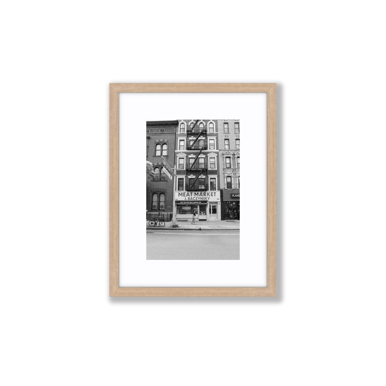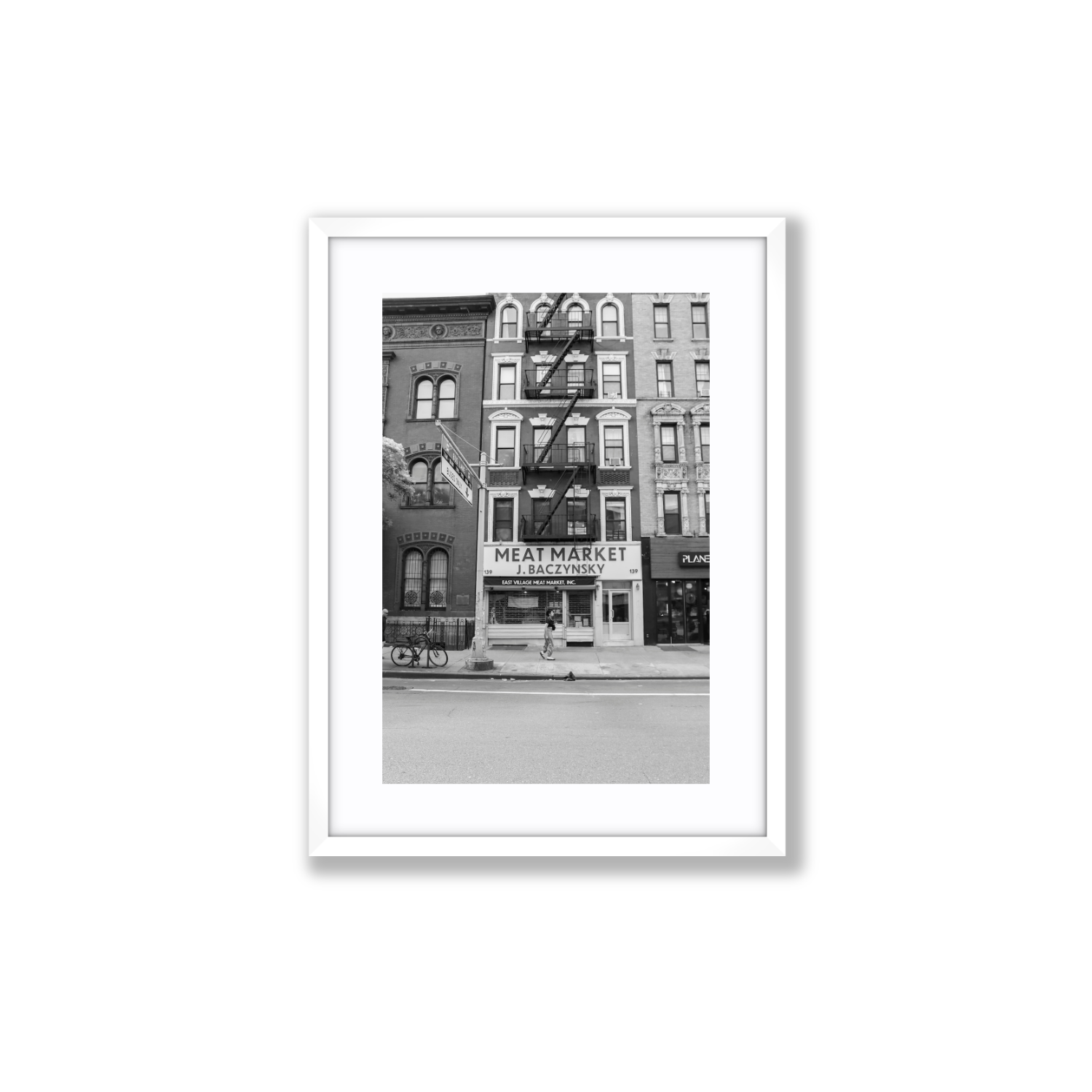 ‘Vertical Village’ offers a stunning juxtaposition of heritage and urban architecture in New York’s East Village. This black-and-white fine art photography print captures the iconic East Village Meat Market with its Meat Market and J. Baczynsky signs, proudly representing the longstanding butcher shop that has served the neighbourhood since 1970. Above the shop, the clean lines of the building's windows and steel fire escapes stretch upward, contrasting with the market’s nostalgic charm. The architectural details of the two neighbouring buildings, visible beside the market, further emphasise the layered history and evolving skyline of the area. With a lone figure walking outside the meat market, the scene evokes a sense of community and continuity, where tradition and modernity blend seamlessly. This fine art print captures the essence of New York’s East Village, where history and urban architecture live side by side.