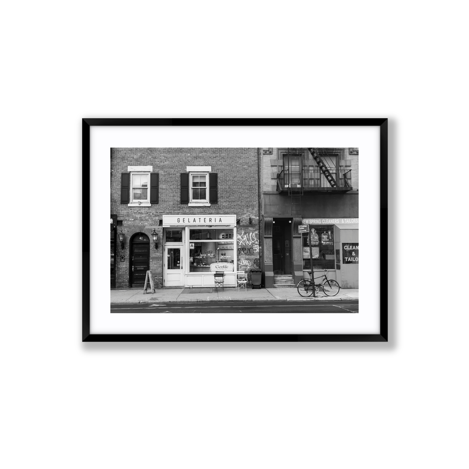 ‘West Village Dolcezza’ captures the charm of a quiet New York street in the heart of the West Village, where history and modernity meet in a striking visual contrast. This black-and-white fine art photography print showcases a quaint Gelateria tucked beneath a brick building with classic windows and shutters, exuding an old-world elegance that feels straight out of Italy. Next to it, a neighbouring building with steel exterior fire escapes and street graffiti adds an urban edge to the scene. At street level, a spring cleaning and tailor shop stands as a testament to the everyday life and hustle of New York City, blending seamlessly with the vibrancy of the street. The combination of these elements paints a picture of a neighbourhood where timeless charm and gritty urban character live side by side. This fine art print embodies the unique spirit of the West Village, where sophistication and urban authenticity meet in one captivating frame.