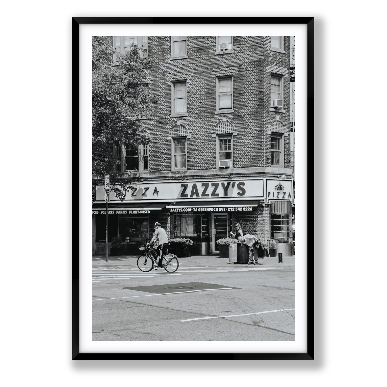 ‘Zazzy’s’ captures a quiet moment on Greenwich Ave in New York’s West Village, featuring the familiar storefront of Zazzy’s Pizza. This black-and-white fine art photography print showcases the classic brick building above the pizza shop, while the street below is marked by crosswalk lines and a cyclist riding past, adding movement to the urban scene. The balance between the stillness of the architecture and the flow of life on the street embodies the everyday rhythm of New York City. This fine art print beautifully captures a slice of New York street life, offering a glimpse into the subtle charm of its neighbourhoods.