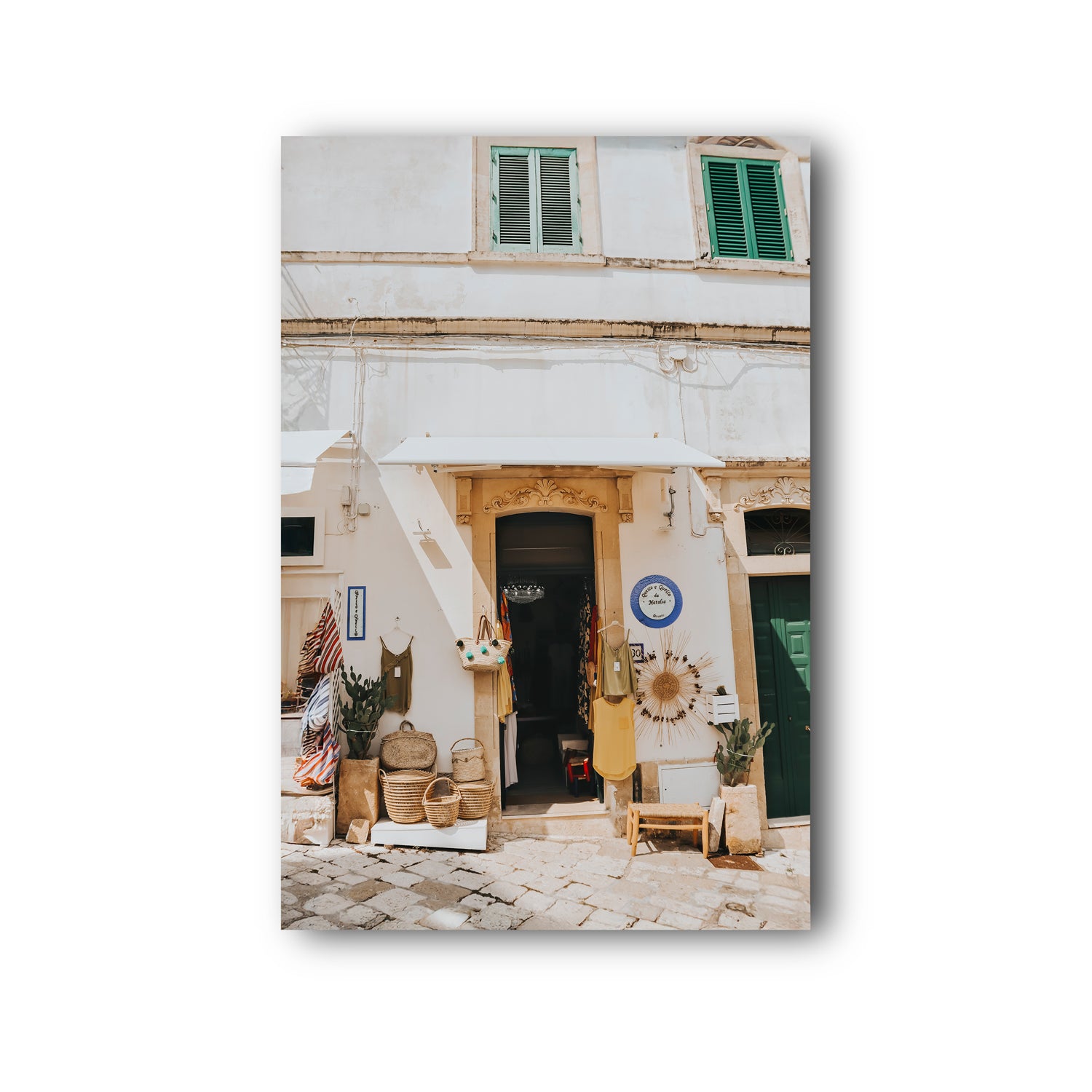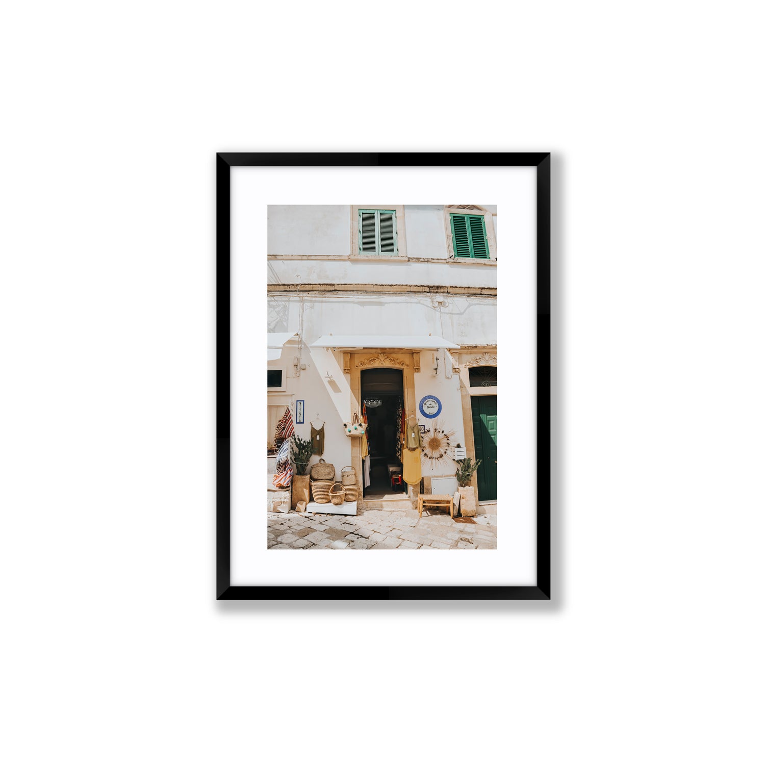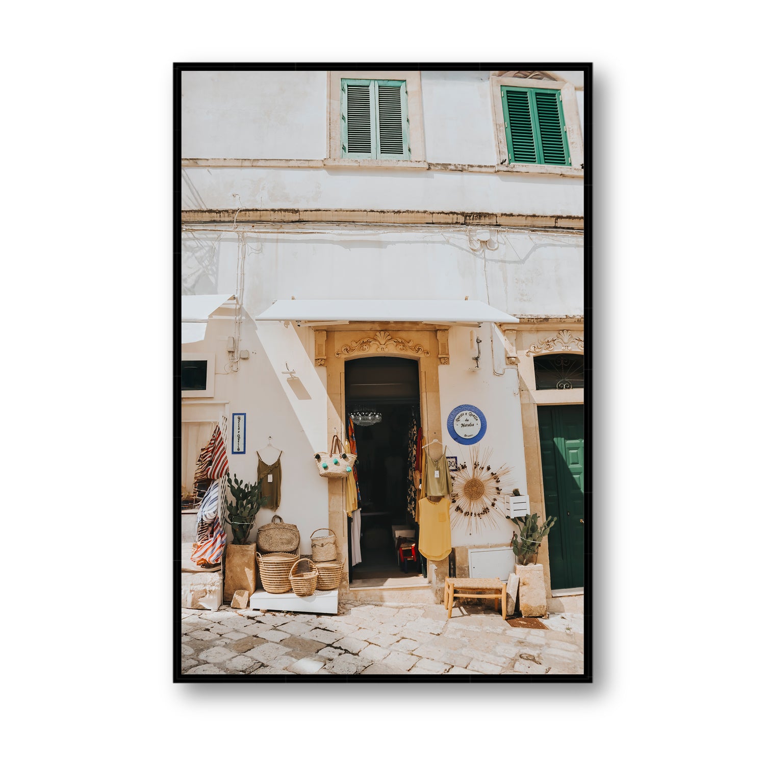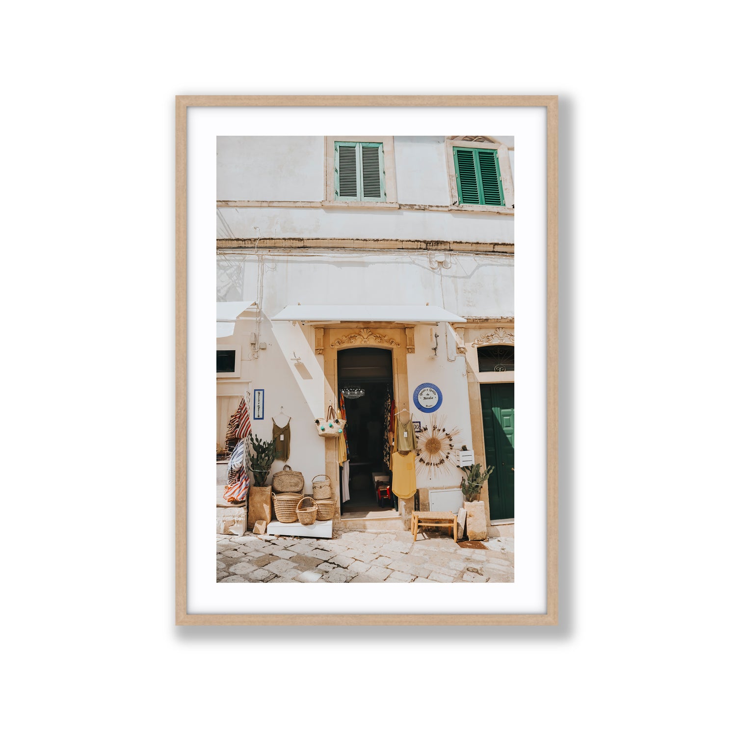‘Artisan Ambience’ fine art photography print captures the charm of a local shopfront in Otranto, a coastal town in Puglia known for its historic stone walls, colourful buildings, and relaxed seaside rhythm. This inviting scene features a curated display of artisan goods - woven baskets, local ceramics, and handmade sandals - framed by textured shutters and sun-worn stone. With soft shadows and earthy tones, it reflects the slow-paced beauty of Southern Italy and the everyday creativity that lives in its laneways. Perfect for interiors inspired by Mediterranean lifestyle, travel, and timeless craftsmanship.