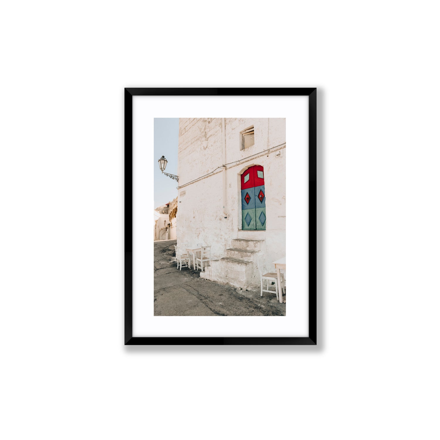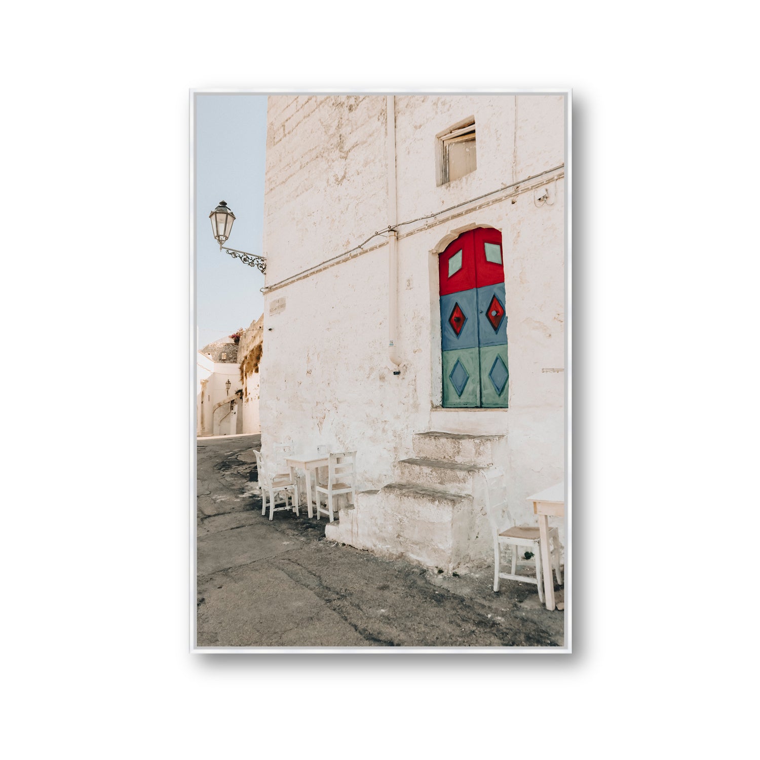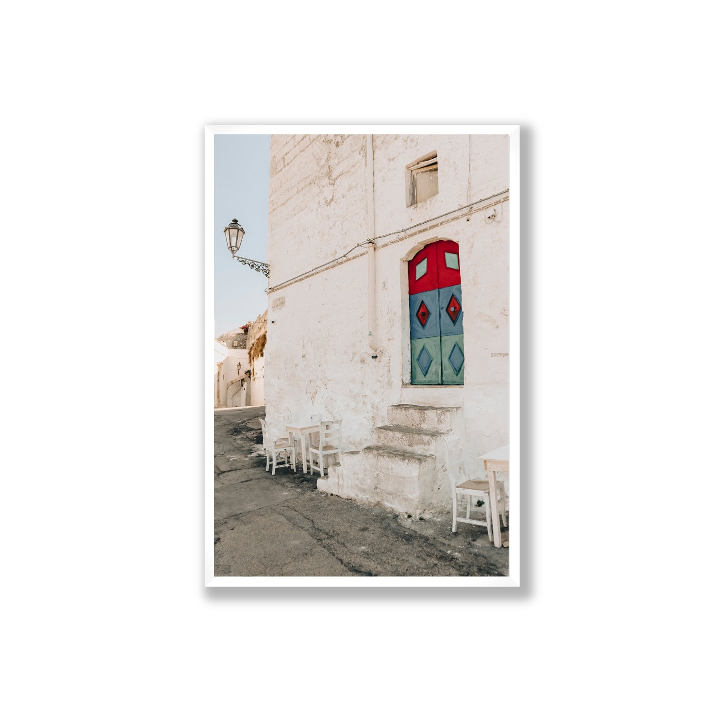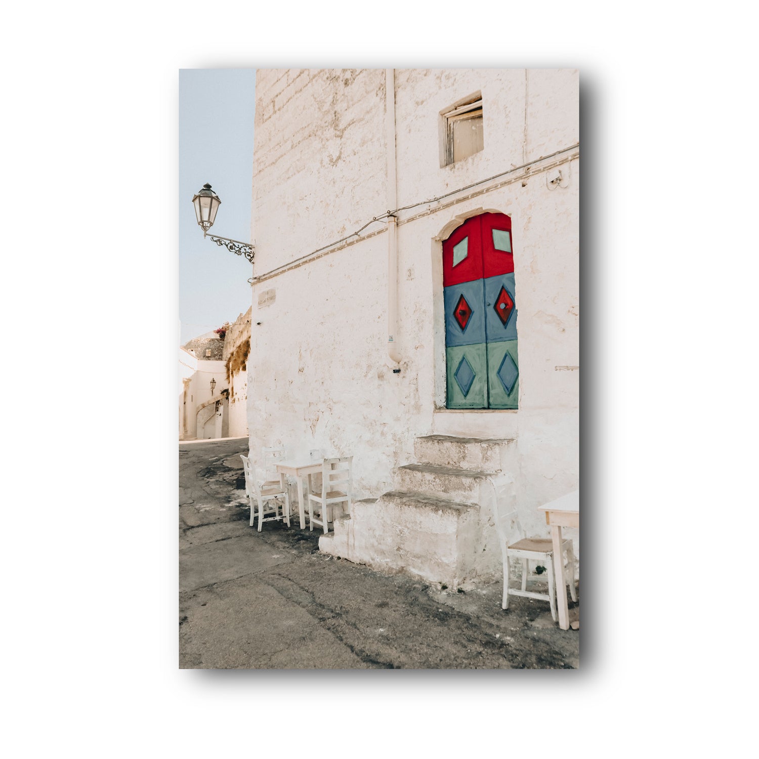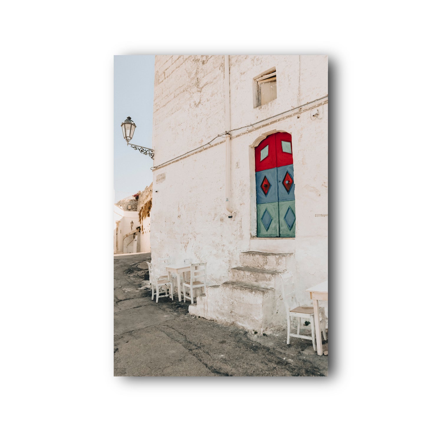 ‘Doorway Delight’ fine art photography print captures a colourful moment in the heart of Ostuni, one of Puglia’s most iconic whitewashed towns. Nestled within textured stone walls, a bold red, blue and green door steals the scene - playful, unexpected, and full of local charm. Set above timeworn stone steps, with scattered chairs lining the curved laneway, the image reflects the layered history and casual beauty of Southern Italy. Perfect for interiors inspired by Mediterranean streetscapes, characterful architecture, and slow travel moments.