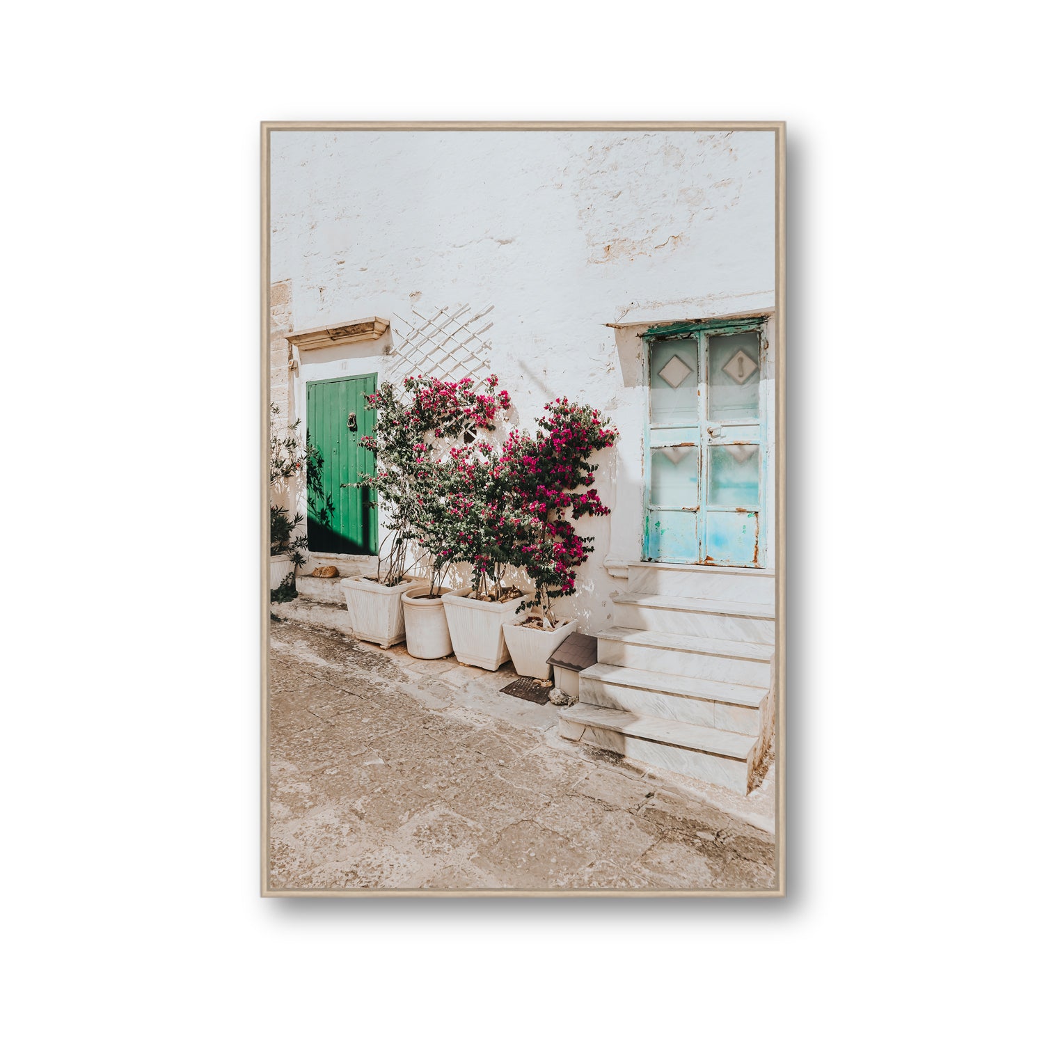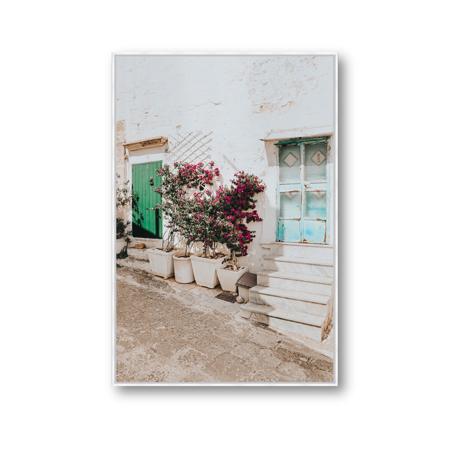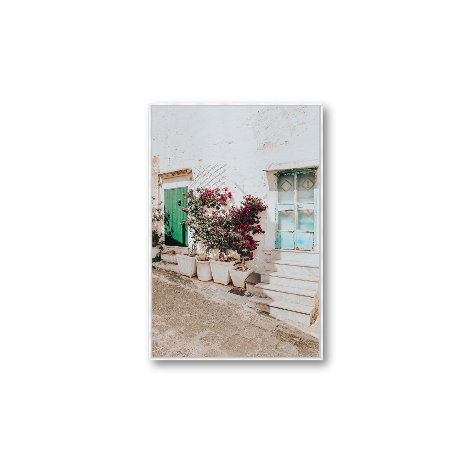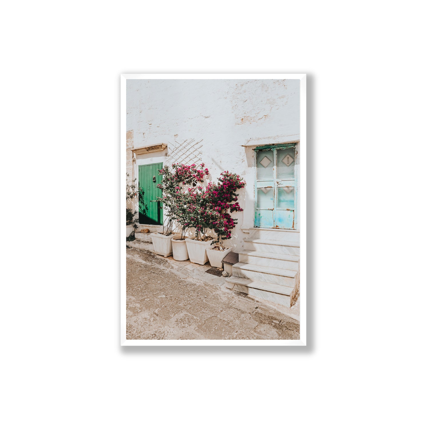 ‘Floral Canvas’ fine art photography print captures a postcard-perfect laneway in the whitewashed town of Ostuni, where bougainvillea spills freely over a cluster of pots, painting the walls in a cascade of magenta blooms. Contrasting pops of green and turquoise — from the rustic doors and weathered shutters - complete the composition, adding a vibrant charm to the sunlit street. This peaceful scene is a visual love letter to Puglia’s slow, blooming beauty, where every wall becomes a canvas and every detail tells a story.