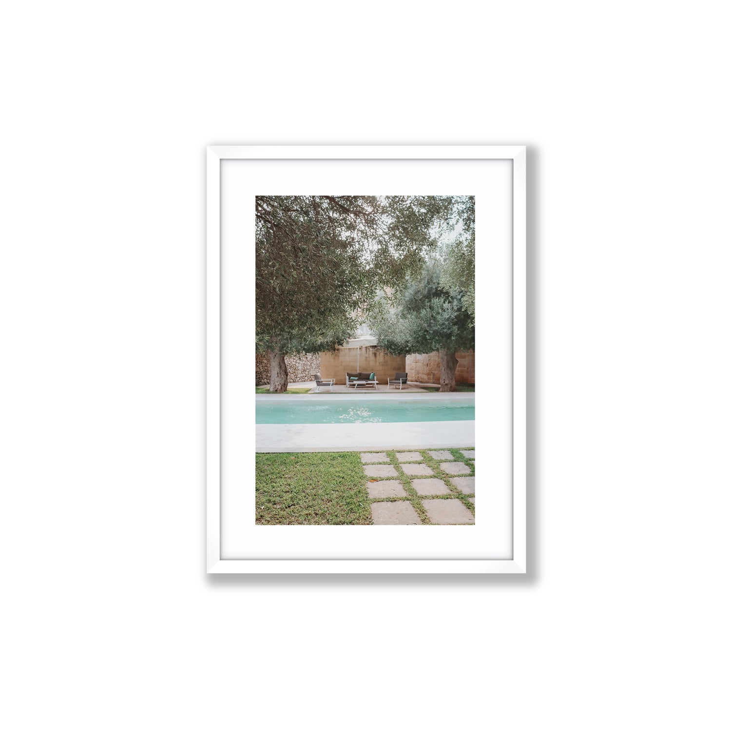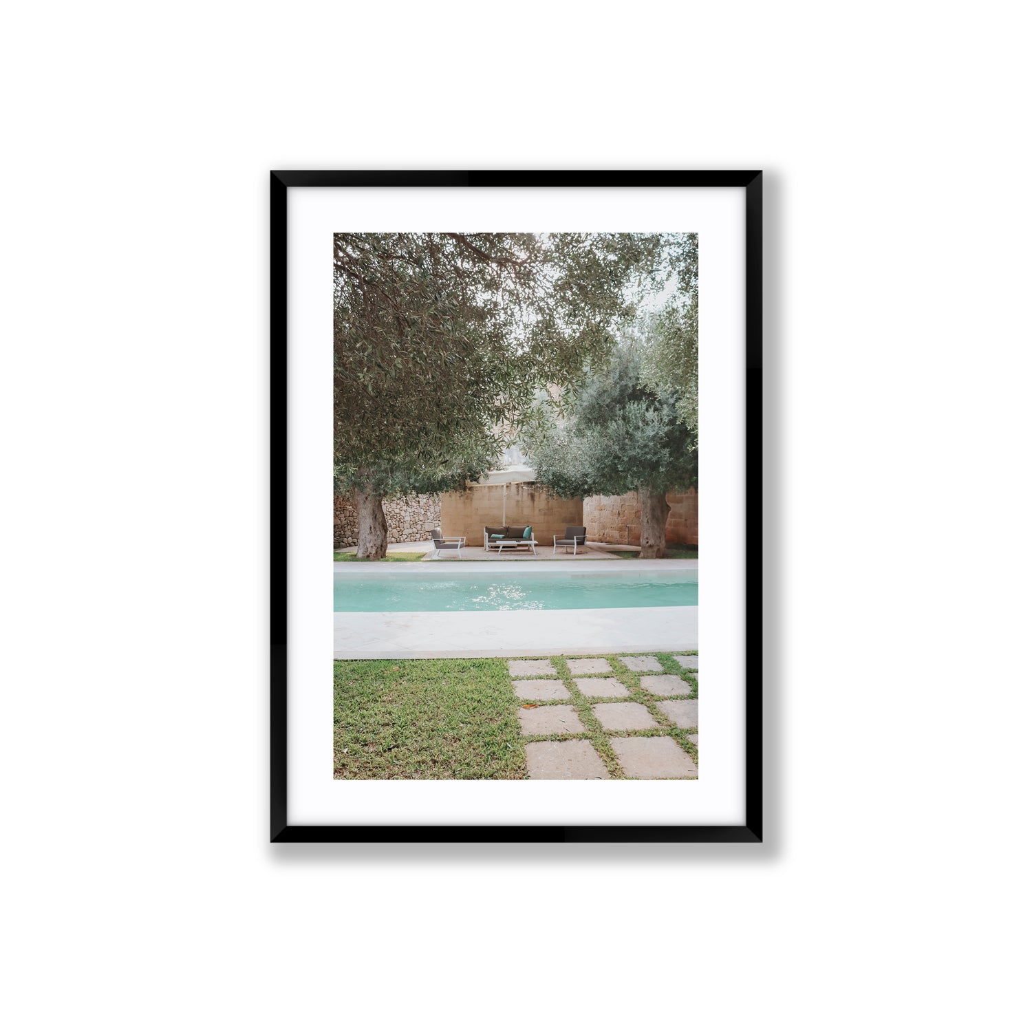 ‘Idyllic Escape’ fine art photography print captures a serene poolside moment at La Fiermontina, a boutique hotel nestled in the historic city of Lecce, Puglia. Framed by centuries-old olive trees and golden stone walls, the scene exudes a quiet elegance, where luxury blends seamlessly with nature. Dappled sunlight dances across the turquoise water, while a cluster of linen-draped lounges invites stillness and solitude. A timeless addition to interiors inspired by Mediterranean landscapes, understated design, and the art of slow living.