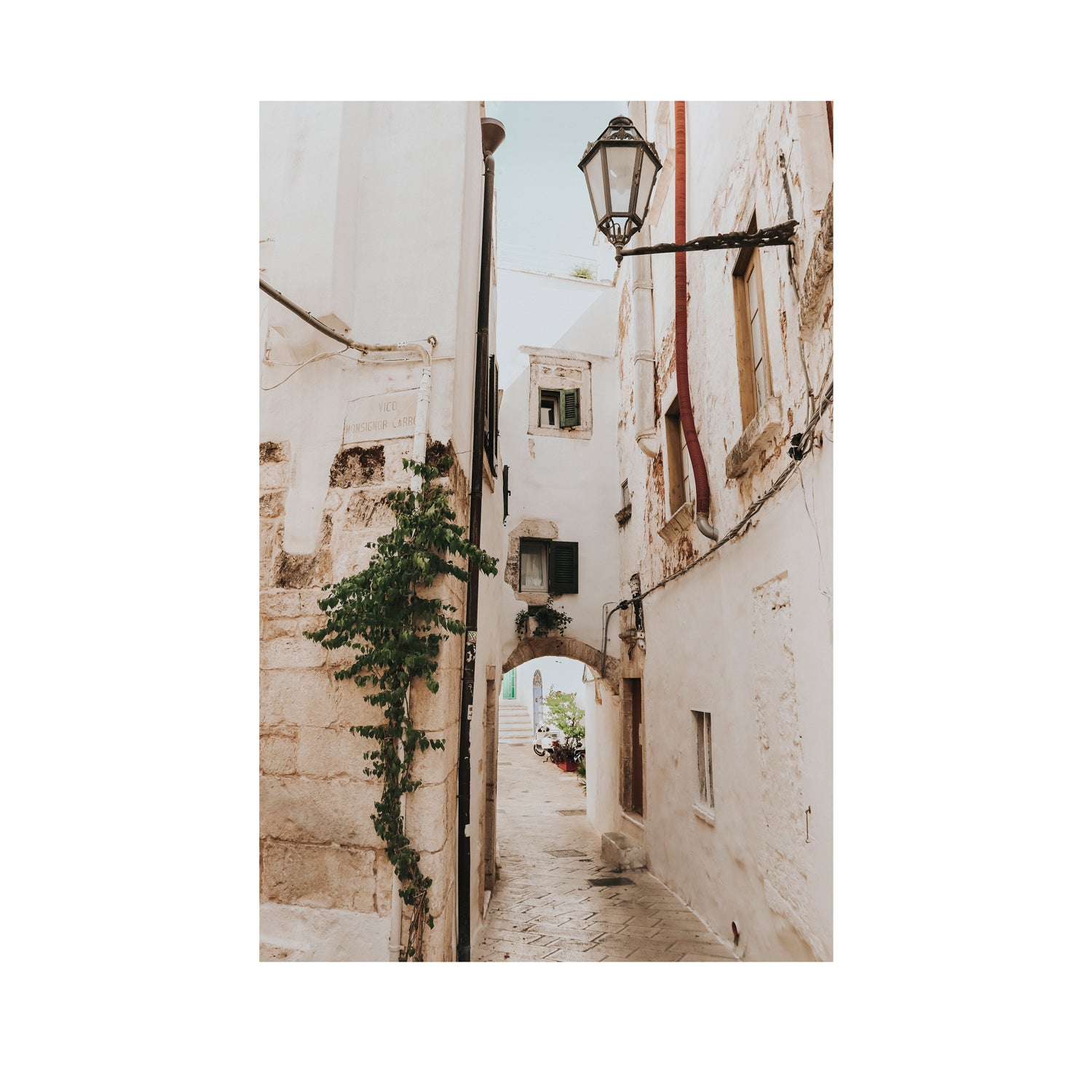 ‘Labyrinth Lanes’ fine art photography print leads you into the winding whitewashed streets of Ostuni, Italy, a town where every turn reveals another story. This peaceful passageway curves through centuries-old stone walls, ivy-covered facades, and archways that hint at secret gardens and sea views just beyond. The dappled light and shadow play adds depth and warmth, drawing you deeper into the maze-like charm of the old town. This artwork captures the quiet wonder of getting lost in Southern Italy’s hidden corners.