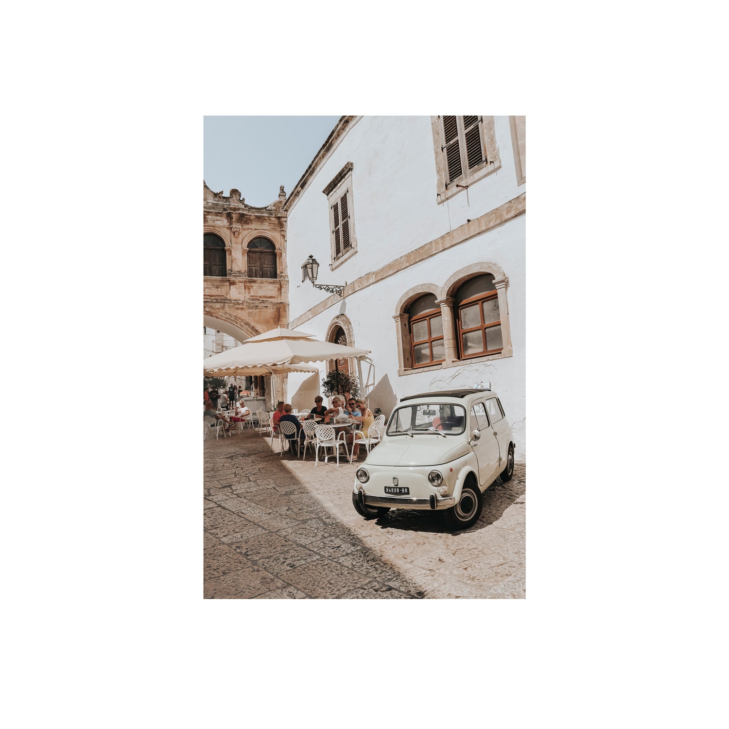 ‘Piazza di Ostuni’ fine art photography print captures the effortless charm of a sun-drenched square in Ostuni, Italy. Locals and travellers sit beneath café umbrellas, lingering over coffee as midday light spills onto the cobblestones. A vintage white Fiat Bambino - perfectly parked as if placed by a stylist - completes the picture, adding a timeless elegance to the warm stone setting. With its classic Southern Italian palette and sense of unhurried joy, ‘Piazza di Ostuni’ brings a slice of la dolce vita into your home.