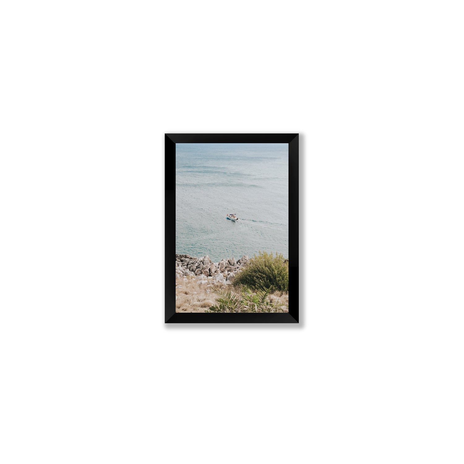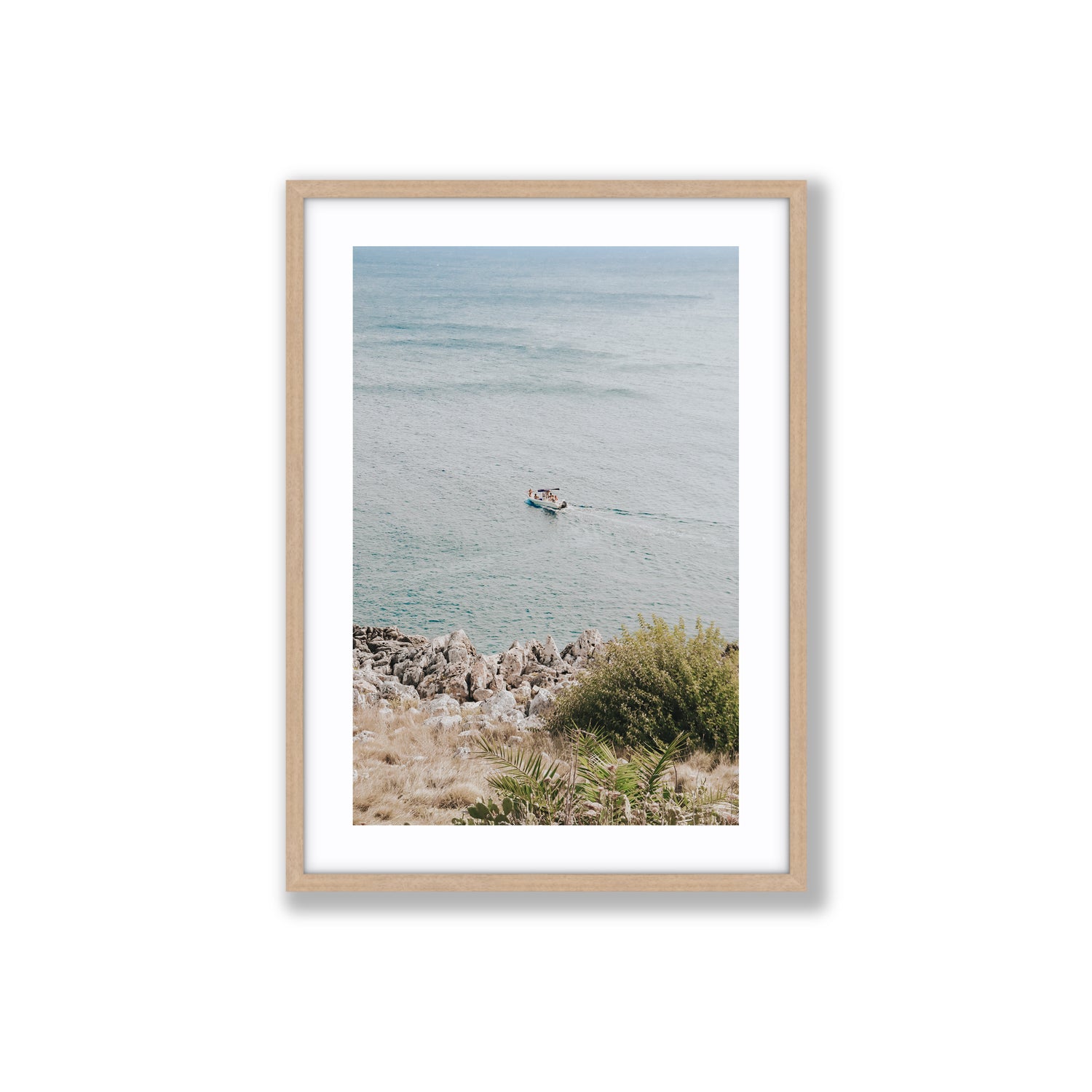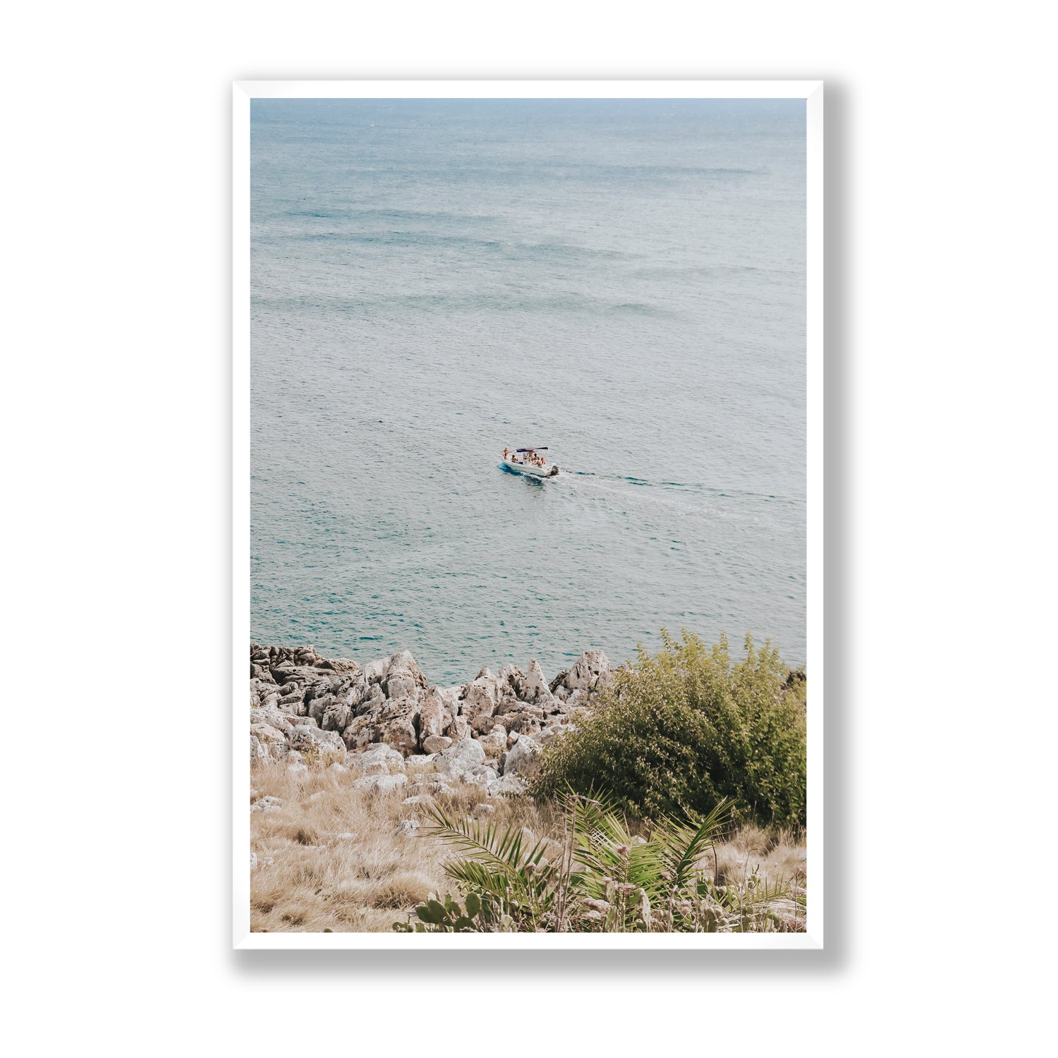‘Puglian Departure’ fine art photography print captures a tranquil moment off the coastline of Santa Cesarea Terme, a picturesque town on Puglia’s Adriatic shore. A small boat glides quietly across the open sea, framed by rocky cliffs and wild Mediterranean foliage. The scene is minimalist yet layered, evoking the feeling of watching from above as life gently moves forward below. With its soft tones and vast horizon, this print brings a sense of calm, freedom, and coastal escapism - perfect for interiors inspired by nature, travel, and the slower pace of Southern Italy.
