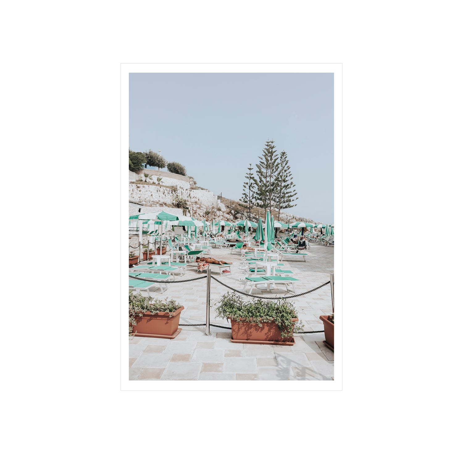 ‘Siesta on The Terrace’ fine art photography print captures a dreamy coastal moment in Santa Cesarea Terme, a seaside spa town along Puglia’s Adriatic coast. Set on a sun-drenched terrace lined with mint green umbrellas and matching loungers, the scene evokes a sense of Mediterranean leisure and retro resort charm. The tiled flooring, potted plants, and surrounding cliffs create a beautiful contrast of nature and design, inviting you into the rhythm of long, slow afternoons by the sea. A refreshing addition to interiors inspired by European beach clubs, vintage summer holidays, and relaxed luxury.
