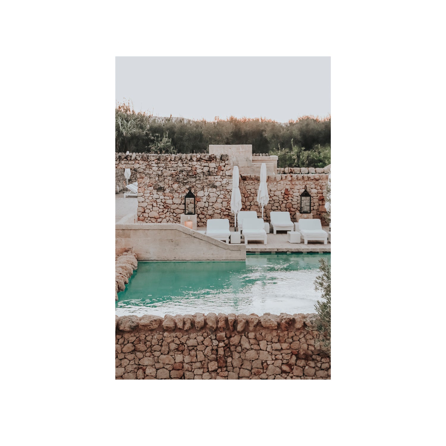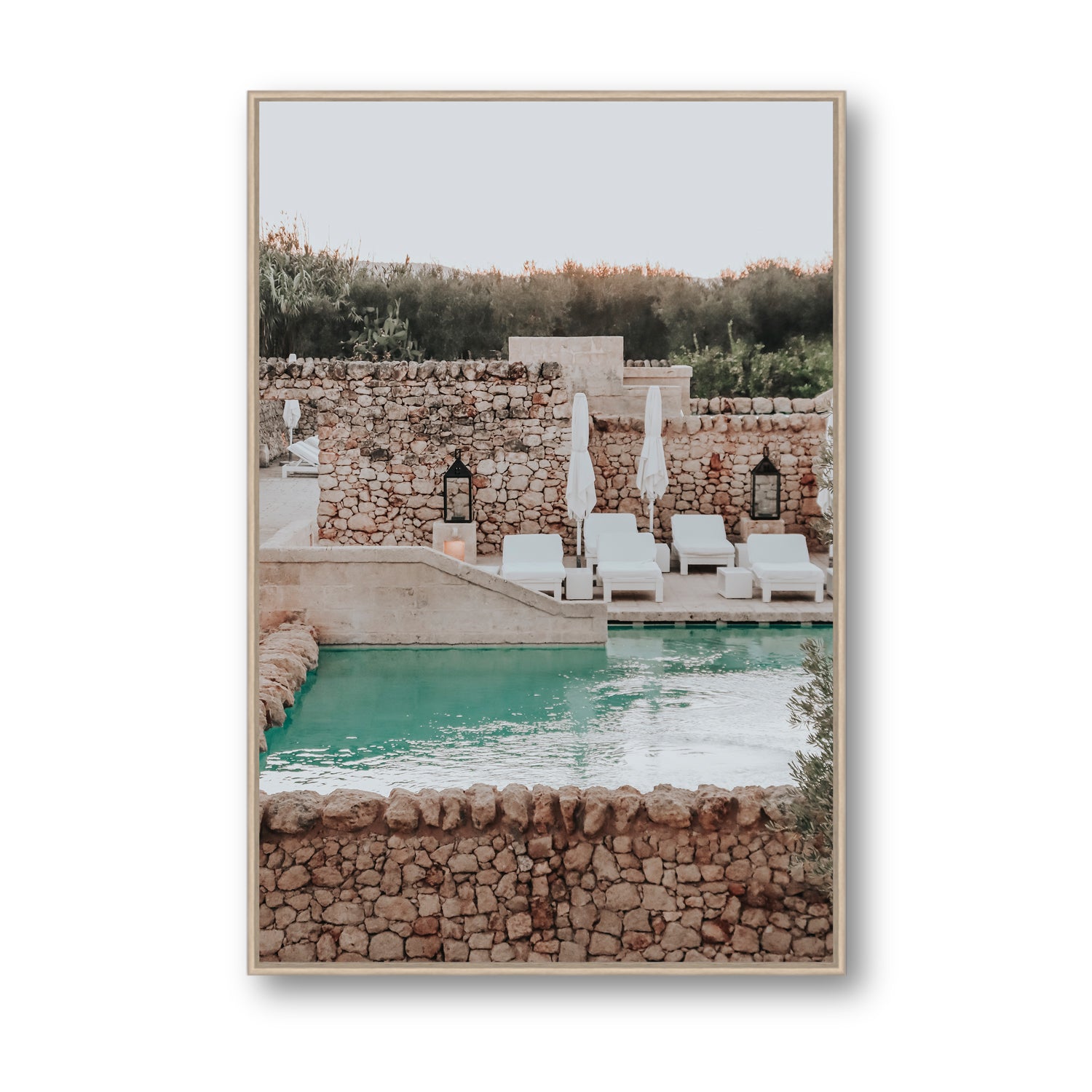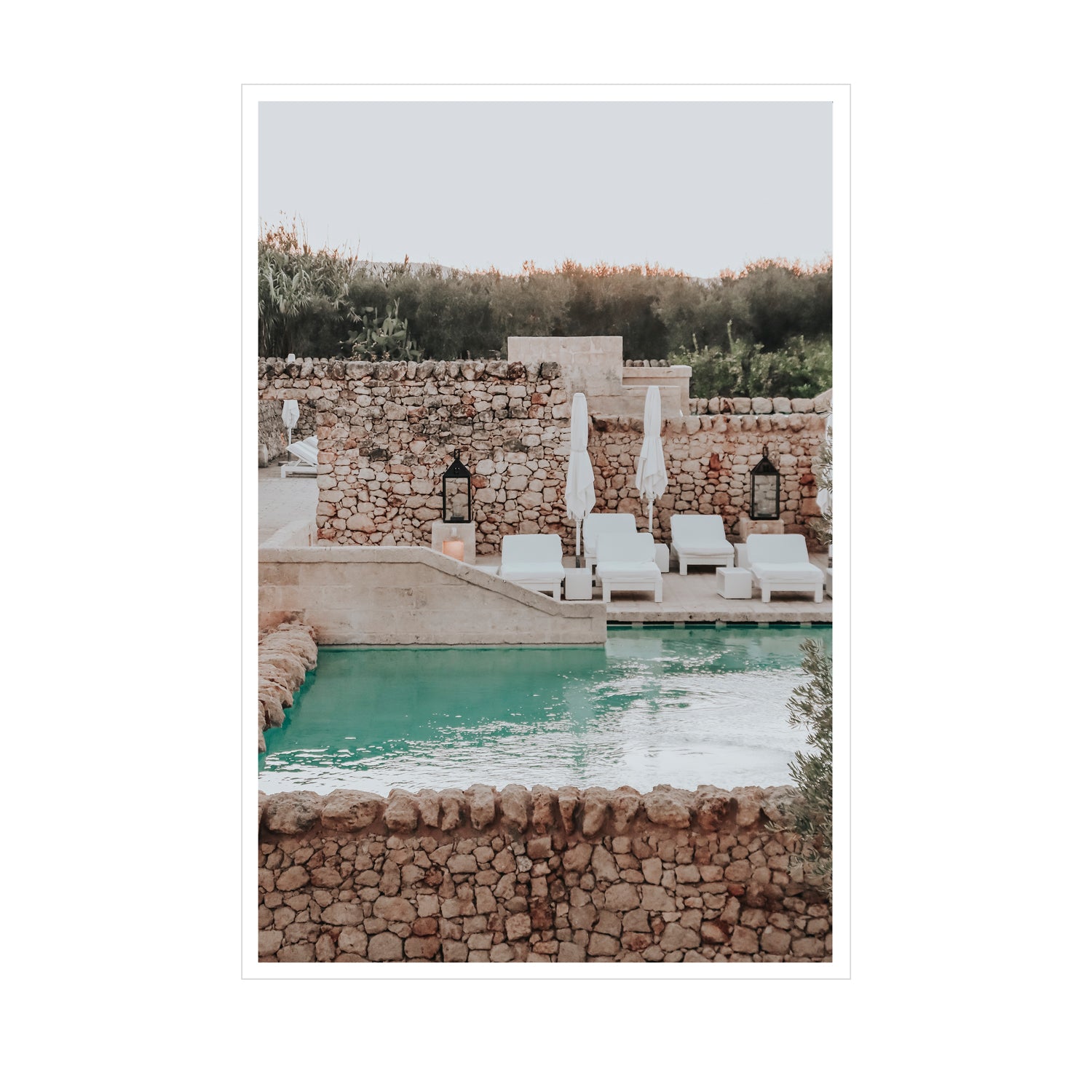 ‘Stone Refuge’ fine art photography print captures the tranquil beauty of Borgo Egnazia’s poolside retreat in Savelletri di Fasano, Puglia. Set against a backdrop of handcrafted Apulian Tufo limestone, this Mediterranean scene embodies quiet luxury and rustic elegance. The sun loungers sit still beneath folded umbrellas, while the surrounding stone walls, textured and timeless, echo the architectural traditions of ancient Puglian villages. A peaceful, grounding piece for interiors inspired by slow travel, Mediterranean escapes, and the understated charm of heritage design.