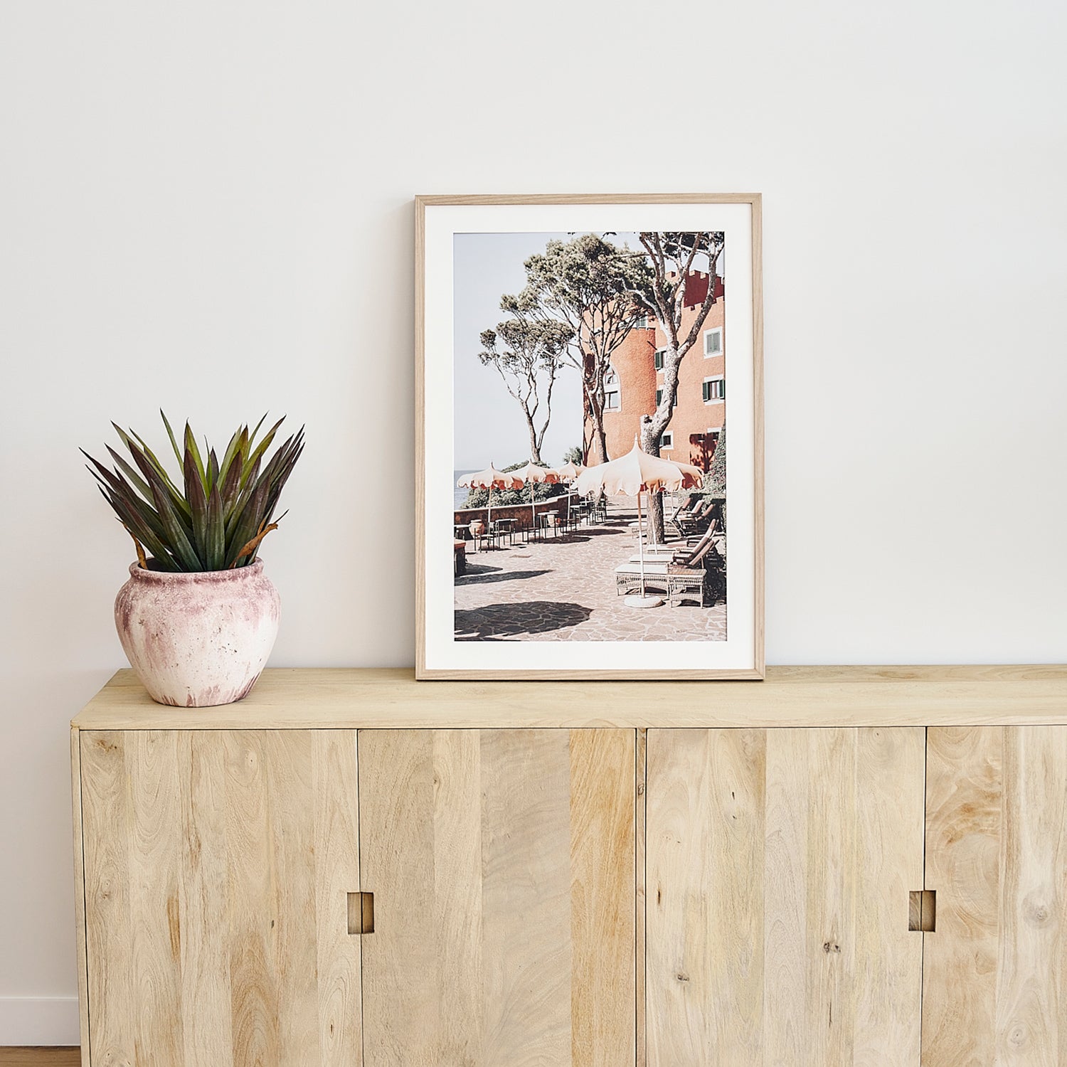‘Solitude by the Sea’ fine art photography print captures the timeless elegance of Hotel Il Pellicano, nestled along the rugged Tuscan coastline. This striking composition focuses on the hotel’s iconic stone architecture, where layered terraces and rustic stone walls cascade down towards the unseen shoreline. A solitary figure stands on one of the levels, gazing into the distance, immersed in the peaceful beauty of this secluded retreat. The scene is framed by the lush greenery of the cliffs, adding depth and contrast to the warm Mediterranean tones of the stone. A celebration of understated luxury, tranquillity, and the charm of hidden coastal escapes, this fine art print brings a sense of stillness and refinement to any space.